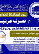 بدأت مساء اليوم الثلاثاء عملية صرف مرتبات شهر يونيو ٢٠٢٢م لمنتسبي وزارة الداخلية عبر شركة الإنماء إكسبرس ووكلائها في المحافظات المحررة. واعلنت شركة الانماء اكسبرس للصرافة عبر صفحاتها الرسمية بم...