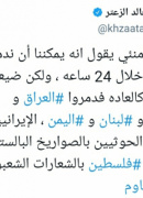 هاجم المحلل السياسي السعودي خالد الزعتر، نظام ملالي طهران، مؤكدا أنه يهدد إسرائيل، بينما يدمر اليمن والدول العربية. وقال في تغريدة على حسابه بموقع التدوين المصغر تويتر، اليوم إن: "ممثل خامنئي يقول...