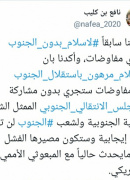 أشار الناشط السياسي نافع بن كليب إلى أن استبعاد القضية الجنوبية من المفاوضات يقضي على فرص السلام، موضحا أن تحقيق السلام مرهون باستقلال الجنوب. وأوضح في تغريدة على حسابه بموقع التدوين المصغر تويتر،...