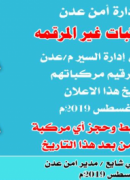 وجهت ادارة امن عدن ومديرها اللواء شلال علي شاىع تنبيها الى مالكي السيارات غير المرقمة بالتوجه الى ادارة شرطة السير لترسيم وترقيم سياراتهم اعتبارا من اليوم الثلاثاء 20 اغسطس 2019 وحتى 31 من الشهر...